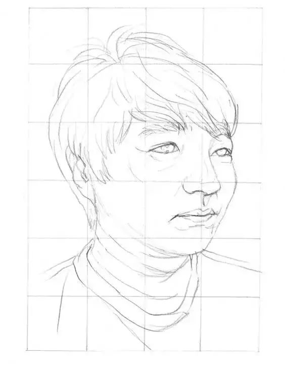 1.在纸上以边长5cm的方格为单位,轻轻画出宽幅为4个网格、高度为6个网格的网格线。用记号笔在透明纸上也画出一样的网格线。将照片以A4大小输出后盖于标记好网格线的透明纸下方。从左上方开始,对应地在纸上一格一格地画出人物草稿。