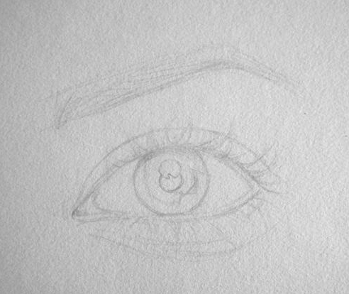 第二步:细化眼睛,把眼瞳的的外部布局线条绘制出来,同时要把眼睛暗部的位置画出来。然后把眼睫毛的线条悄然的勾画一下。
