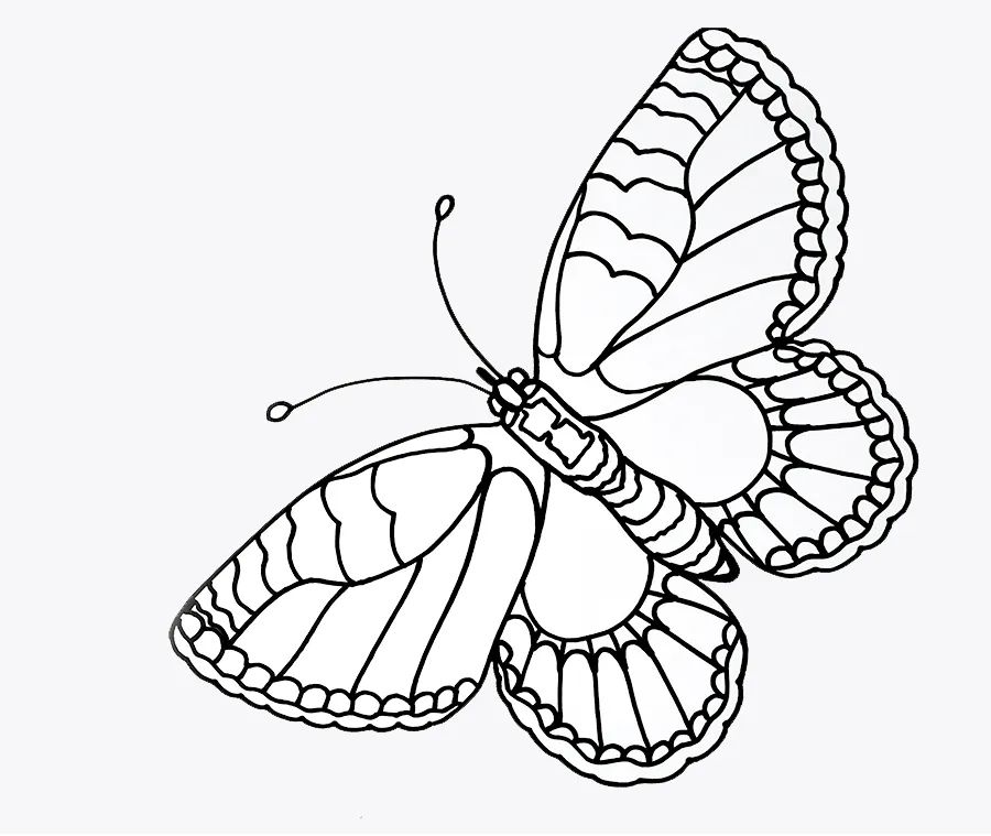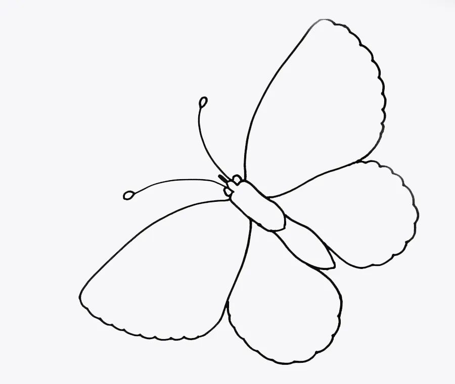 蝴蝶的身体分为头、胸、腹,两对翅,三对足,在白色卡纸上我们先用流畅的线条和简洁的形状概括出蝴蝶的基本外形结构
