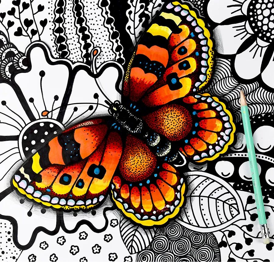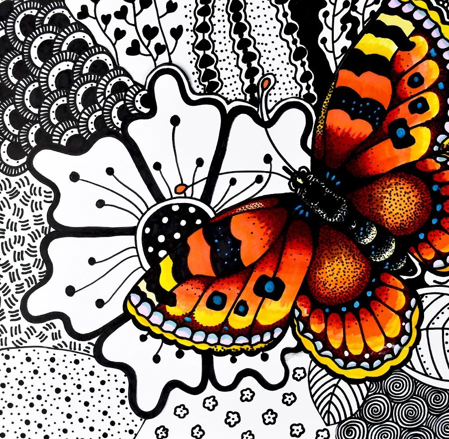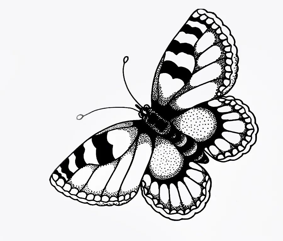 用禅绕画的艺术形式填充背景,使背景中黑白的点线面与鲜艳的蝴蝶形成鲜明的对比,增强作品的装饰性和视觉表现力。在绘画的过程中,除了前景的蝴蝶,背景同样扮演着至关重要的角色。在为作品的背景选择填充时,我们可以采用禅绕画这一充满魅力的艺术形式。在绘制禅绕背景时,线条的疏密、曲直、粗细及整体的黑白灰变化都成为调和画面的关键因素,赋予了作品丰富的层次和深度。正是这样丰富而具有变化的禅绕背景,与前景中色彩鲜艳、活力四溢的蝴蝶形成了鲜明的对比。这种对比不仅让作品更具装饰感,同时也增强了视觉的吸引力。