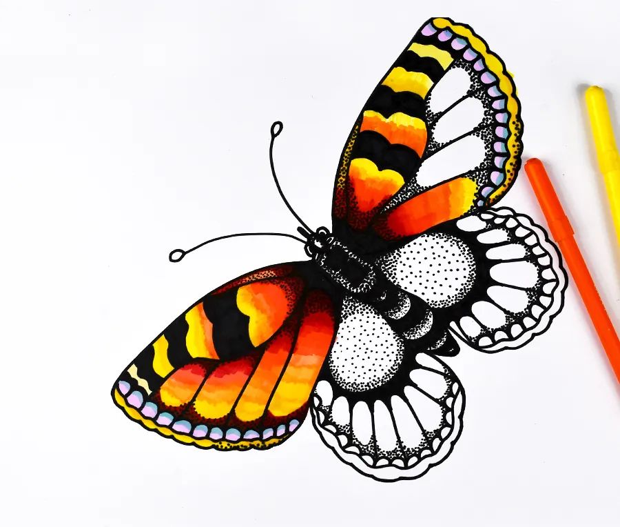 用记号笔对翅膀花纹进一步进行刻画,通过点、线、使翅膀呈现出黑白灰的节奏韵律