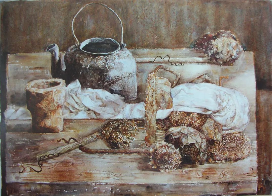 从他的水彩作品中能看出,在他现实主义的画风下,其中还蕴含着松动写意似的随意,我们在其简约的画面里能领略到渗透出的更浓郁的形式美感。纵观美术史历程,以静物作为主要创作主题的艺术家层出不穷,丢勒、夏尔丹、塞尚、凡·高、莫兰迪、阿利卡等等,他们都试图在普通的物体中探究艺术规律,通过物体的独特表达呈现个人的艺术观念、人生感悟等。普通的物品一旦被艺术家注入了自己的情感,就拥有了鲜活的生命,展现岀感人的力量。