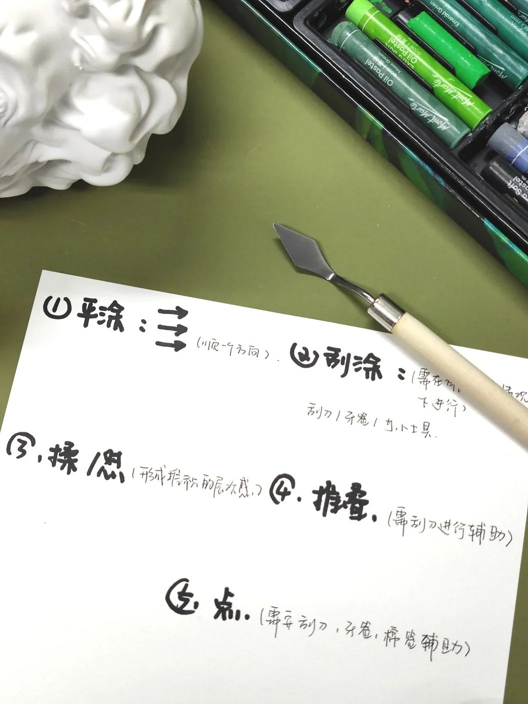 常用于颜色覆盖或画具有肌理感的画面.油画棒在画纸上用力地堆叠勾勒。油画棒的柔软性能使画面产生油画的厚重感 。
