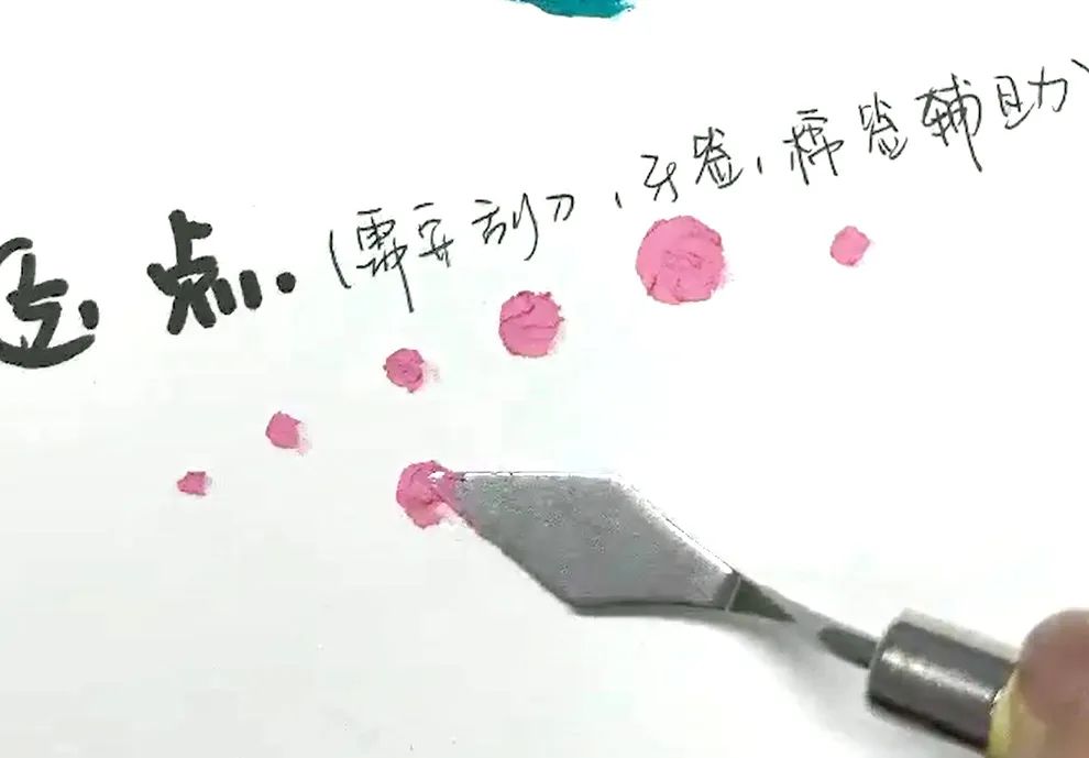 点画法多用于具有装饰性的画面,用于对物体或画面背景的装饰。用尖头刮刀少量多次的进行堆画,形成原点,也可取少量油画棒搓成圆球按压于画面上形成原点。