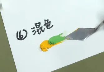 为了丰富画面的色彩、产生富有变 化的层次感 , 利用刮刀等绘画工具将两种颜色混合均匀,形成新的颜色。