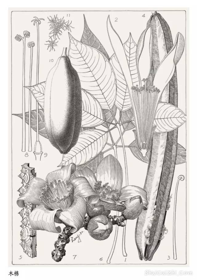 曾孝濂绘制的木棉,将木棉的各个器官放在纸面上,构图能力十分强。图片来自《云南花鸟》