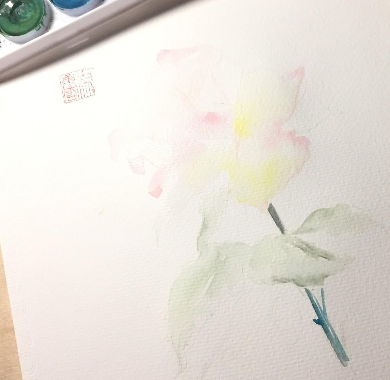 第四步:重复上述步骤给剩下的花瓣上色,画的时候注意水分的控制;以及花瓣颜色的深浅区别,画的时候可以在花瓣内部加入一些黄色在里面,丰富花瓣的色彩。