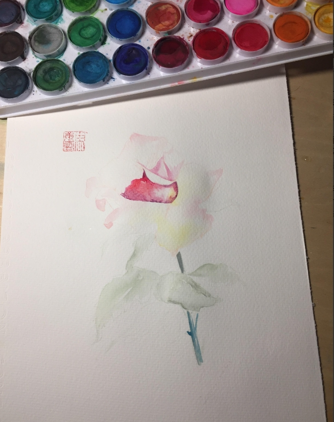第二步:从玫瑰的中心部分开始上色,可以先用清水将花瓣打湿,然后红色用水稀释后逐层上色,一点点的加深颜色,亮部可以加入一些柠檬黄在里面,注意花瓣的留白。