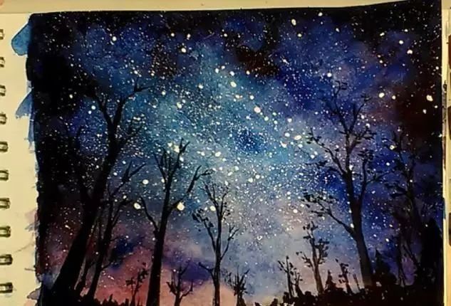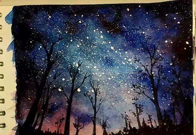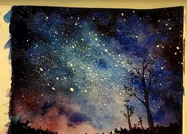 树间天空的颜色,你能看出来吗?再加深星空的颜色。