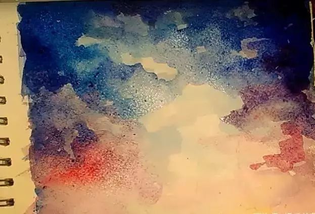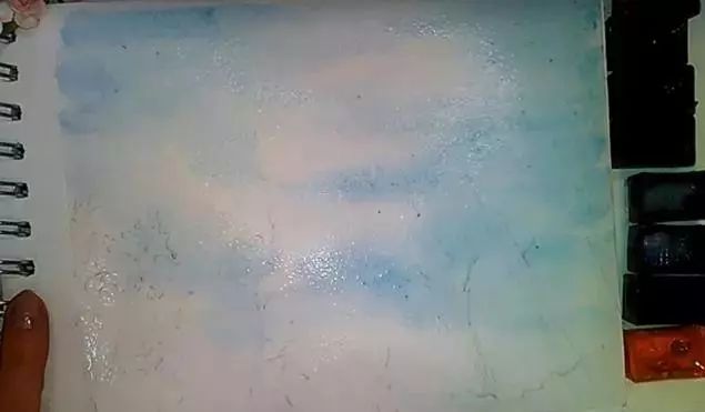 最开始用这种浅浅的蓝色给天空布上色。中间浅两边蓝,适中的力度画,尽量均匀地画每一层。