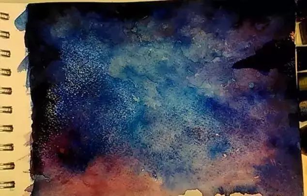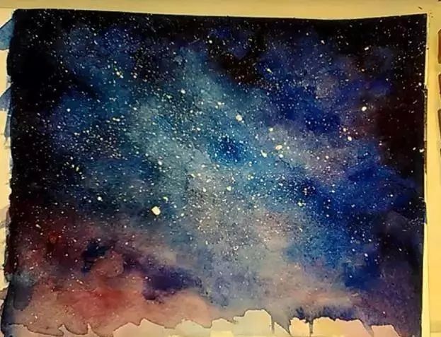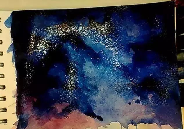 然后在用手和笔弹出白色的星星点点。这样弹出来的星星笔一颗颗画出来的更加自然。在水彩画笔画几颗大点的星星。