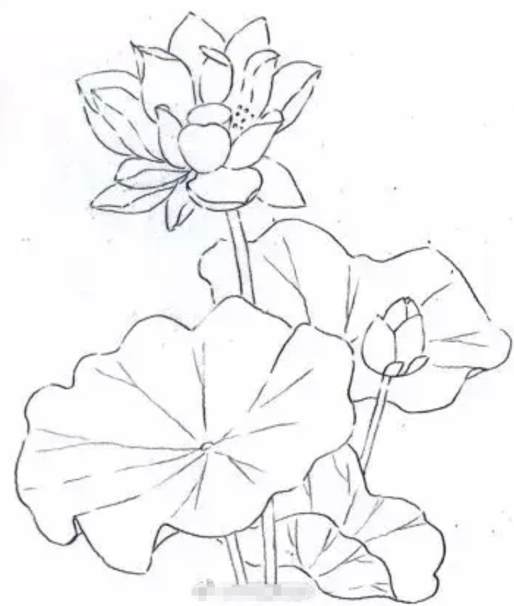 第1步:用2B铅笔画出荷花轮廓,注意构图,线条要流畅