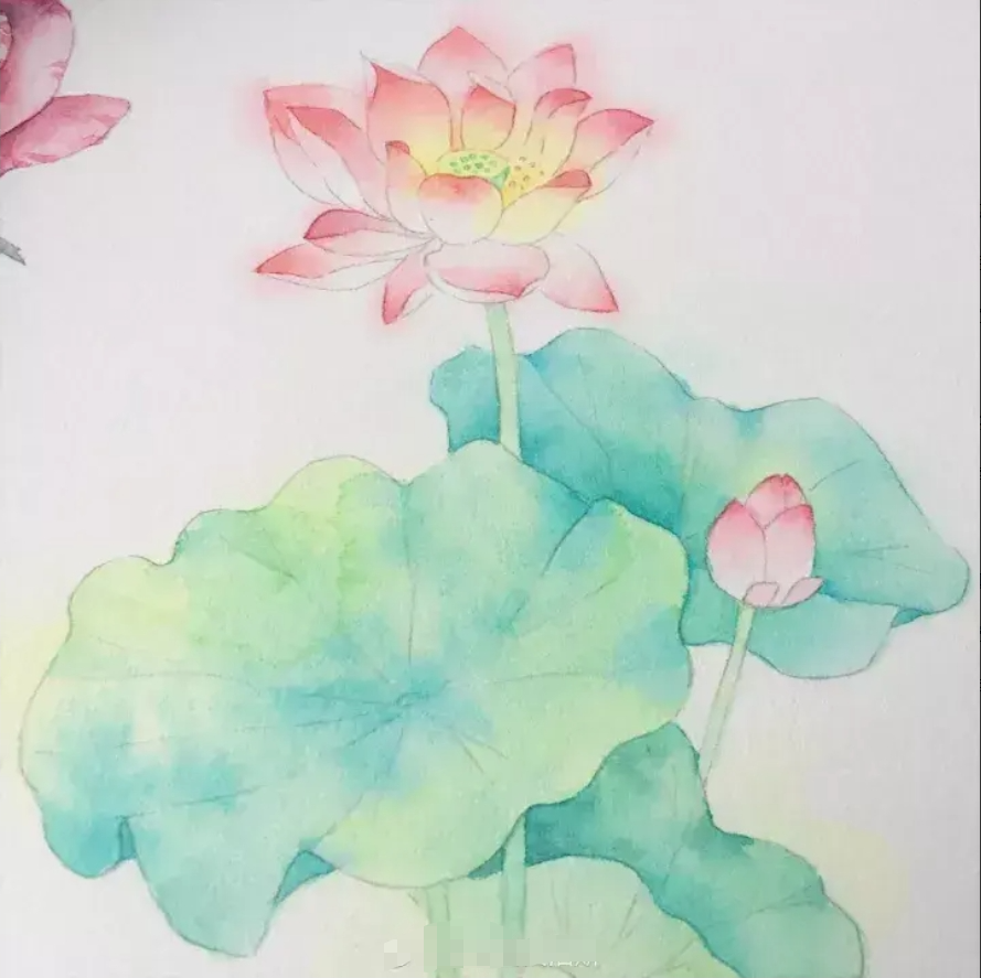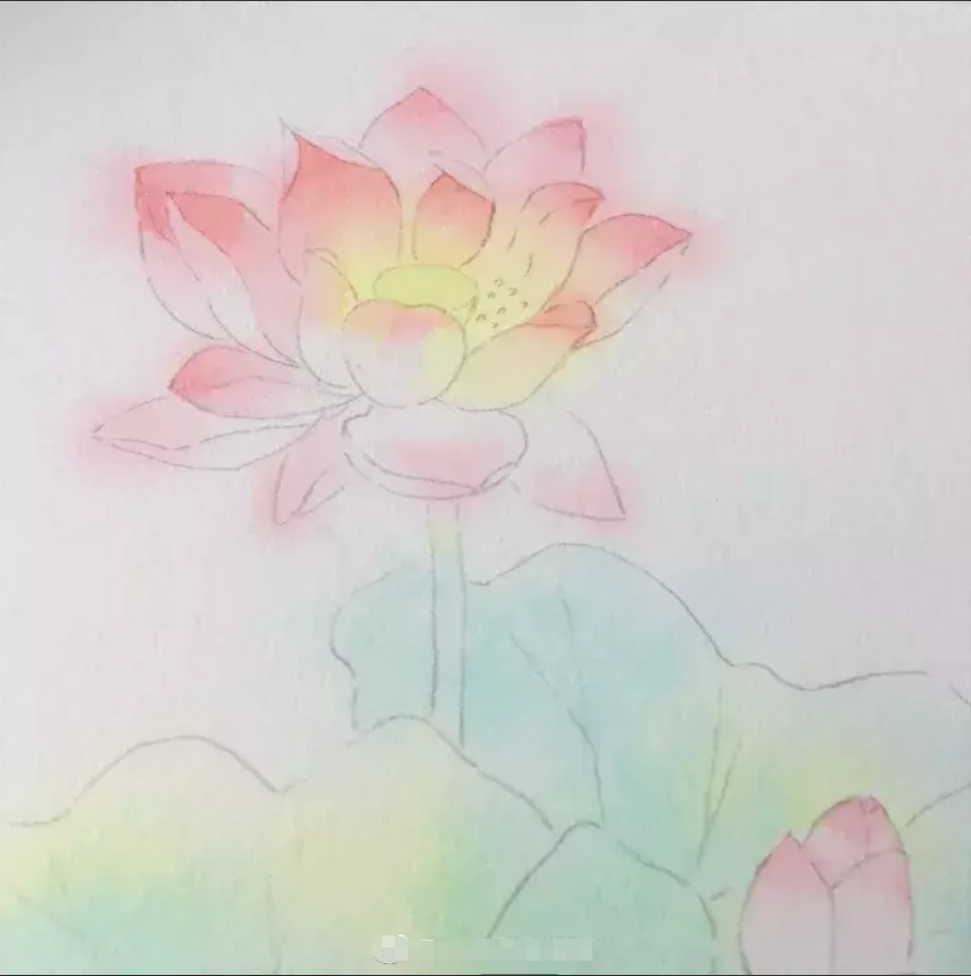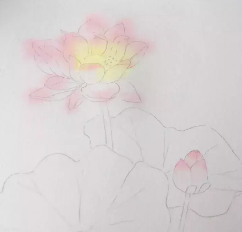 水分不能太多,再用{018号}淡黄晕染中间黄色的莲蓬,用{156号}玫瑰红加少量水晕染花瓣和花苞