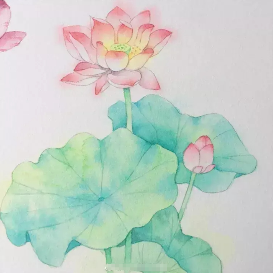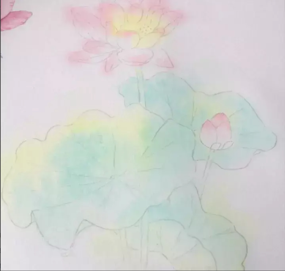 加少量水晕染荷叶,荷叶边沿部分用{018号}淡黄晕染