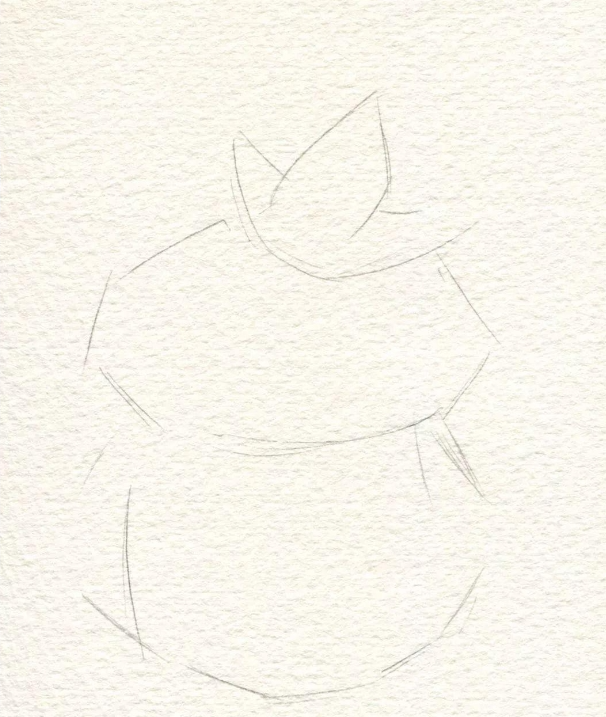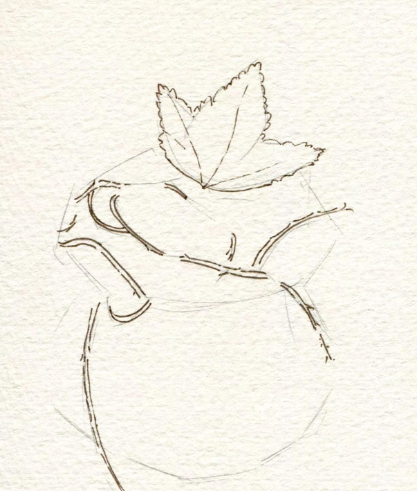 【第1步】:这这幅水彩画有三部分组成,瓶子、果子和叶子。分别用了红色水彩、绿色水彩和灰色水彩。根据下图,画出物体的外轮廓,注意三个区域的比例关系。