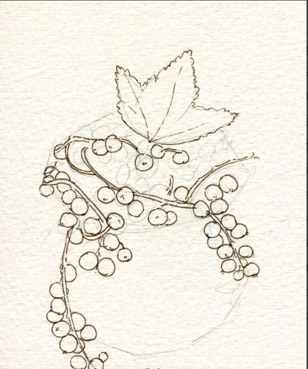 【第2步】:用黑色针管笔为物体描边,画出树叶和果子的枝干;描边的时候用笔要松一些。