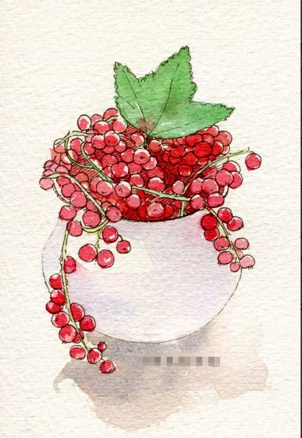 【第5步】:开始上色,用绿色水彩,加少许水,画叶子的颜色;用红色水彩,加少许水,画果子的颜色,暗部的果子颜色重,少用水多用颜色;用灰色水彩,多加水,画投影的颜色。