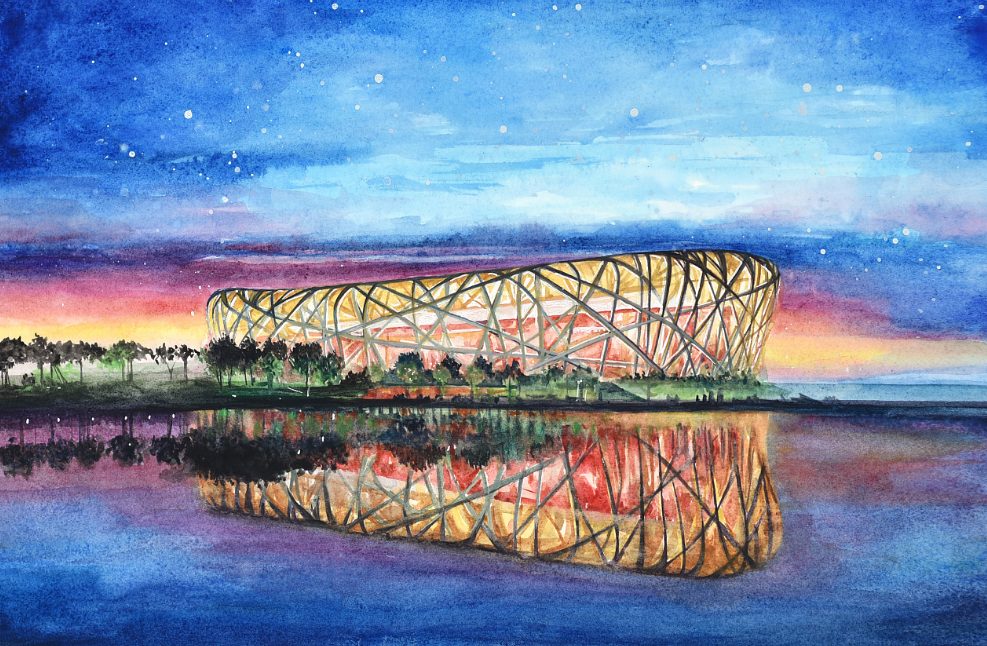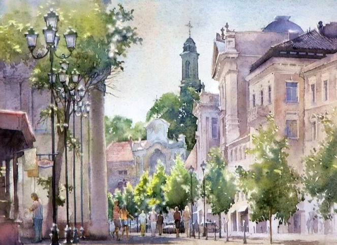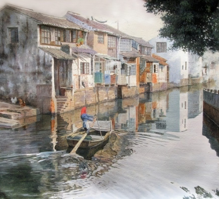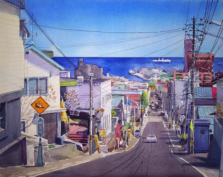 水彩干画法多表现光的反射纹理,在调色板的边缘,控制颜料含量。倾斜画笔,慢慢上色。这一步可以选择平头笔倾斜笔,也可以用榛子笔的腹部作画。这种方法适用于反射光线的海洋等景物。