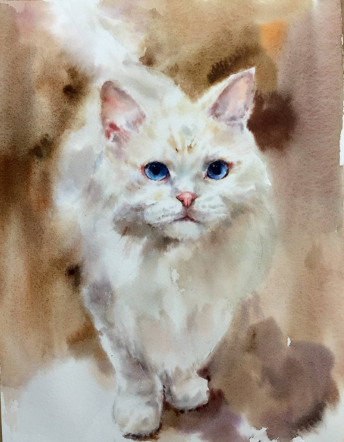 水彩画干画法表达动物的毛发,用高浓度的颜料蘸上画笔,用手指挤压笔尖的颜料,使其含量适当,笔毛分散。把画笔竖起来,用笔尖慢慢地顺着笔。若使用椭圆形笔,可擦出精美的笔触效果。