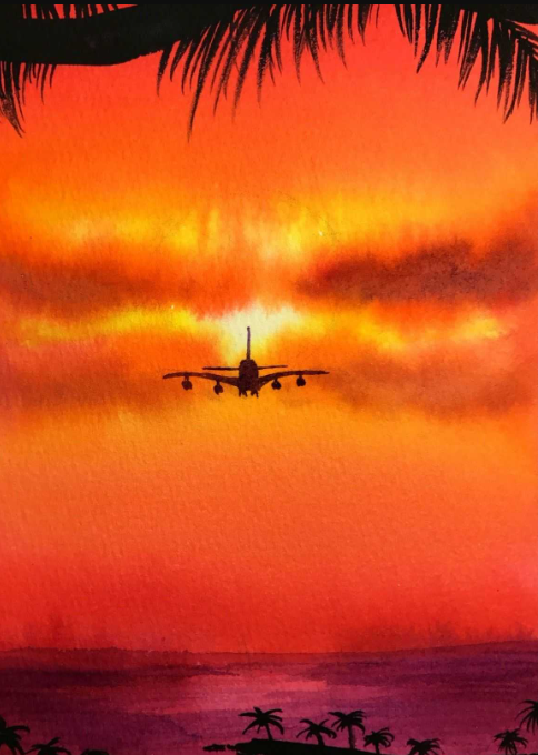 水彩画教程夕阳,最美夕阳晚霞图 创作教程 shuicaimo · 2024-04-10 太阳从天边渐渐落下来,渲染了整个天空。或是紫色微染,或是红如烈火,或是橙如枫叶,美丽壮观。 1 用铅笔打下草稿。色卡由浅至深依次上色 2 先铺上一层水,注意太阳处留白,随后快速上色 3 等半干时用美利蓝刷出云的底部色 4 等干时刷出水面底色 5 用平板刷刷出水面波纹 6 用黑色画出剪影,可以全黑 7 用面相笔画出飞机形状,远处稍微虚一点,所以不能全黑 8 进一步刻画细节即可完成 图文教程 水彩画 风景画