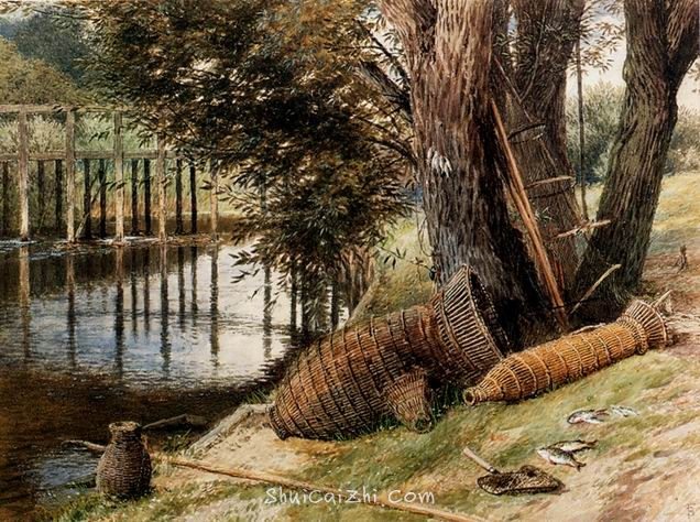 现在该说主要问题了——树旁的鱼具。看来已经小有收获——地下的几条鱼、挂在书上的一串小鱼。忙碌了半天,需要稍事休息,捕鱼人可能方便去了——画家敏锐 地抓住了这一瞬间。画面没有人,但我们会感到捕鱼人很快会回来。请看那三个鱼篓子,是编织物,要细扣。但从绘画讲,素描的整体感要处理好,这对一流画家不 成问题,主要还是色彩。我们对中间大鱼篓从色彩角度每个部位地、乃至每根荆条地去仔仔细细观摩,你会看到一个“真实的”鱼篓放在那里。画家用眼睛去“提炼 出”色彩,再在画纸上、画布上“还原出”客观物体。客观物体永远比绘画更细致、更丰富。同一个鱼篓,五十个高水平画家笔下将是五十个样子,但都画得好。所 以,“源于生活,高于生活”,从绘画的技术角度讲,我认为,叫“源于生活,艺术地再现生活”更贴切些。同一个景物,达·芬奇也不可能把它画绝。