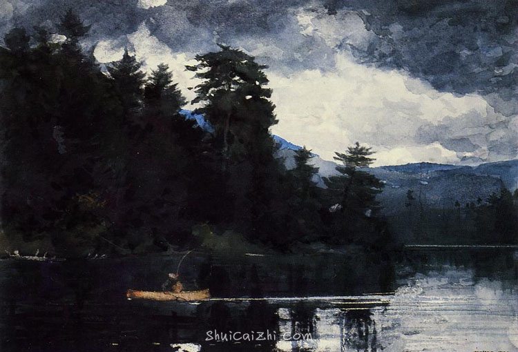 看哪!天空中乌云翻滚——纷乱的笔触起了作用。水中亮部的波纹告诉我们,风已经吹过来了。隐约有雷声。远山从右至左渐变为群青色,很真实。近处树林及其倒 影不是一块死黑,有微妙的冷暖变化,整个倒影略浅些。向左疾驶的小船增加了画面的动感。再过十分钟,雨丝将从天而降。