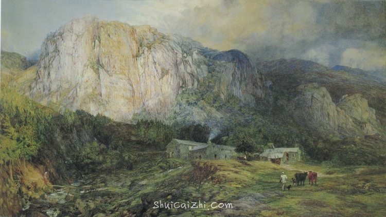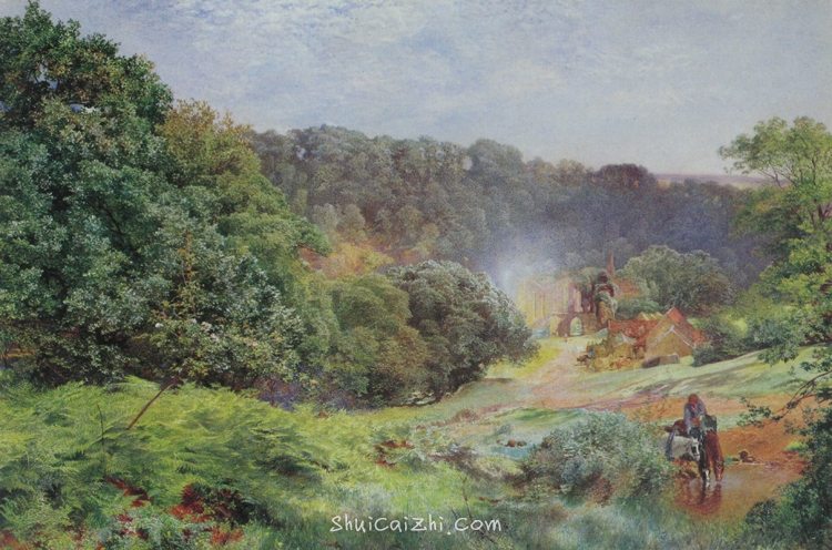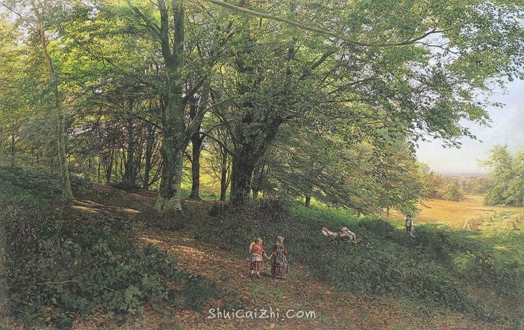 画家用90%的画面刻画山坡和树林。太阳在左上方。密密的树林,在画家笔下却错落有致。阳光透过树叶、风儿在林中徘徊。让我们“走进去”,树阴下歇息一会 儿,烟瘾大的抽袋烟,掏出水壶喝口水。这时候你会考虑这是水彩画、还是油画吗?你会考虑这是 watercolour ,还是往watercolour 里混入了Chinese White 的 Gouache 吗?什么叫好画?这就是好画。它让你身临其境,让你忘我。