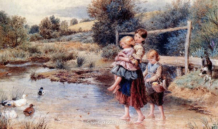 独木桥后的树丛,色彩斑斓、逼真。溪水画得最好:浅而清,近处能看到水底。有几处映出天光,有倒影,加上鸭子荡出的波纹,水边的泥土、水中的水草……,画家从这几个方面的“刻画”,一汪溪水“留在了”画纸上。妙极!