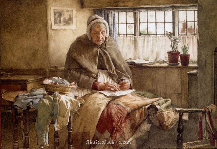 这是一位了不起的水彩大家。我们这里介绍他四张作品。这是第一张。画得很轻松。人物画的好:可能刚才正在织毛活,邮差送来一封信,急急忙忙拆开看信,毛活 暂时放下,线球滚落地下也顾不上了。箱、椅也画得好。地毯和墙布好象随便抹一抹,效果也不错。薄窗帘和茶几上的钩织品画得逼真。当然,最精彩的是窗台上的 几盆花,有一盆是朱顶红吧。噢!茶几上还有一本硬皮书,看来她的丈夫外出久久未归,这封信肯定是它丈夫寄来的。从女主人的表情看,有好消息。假如你正出门 在外,看过此画,你不想自己的家吗?——真有瞧头的好画呀!
