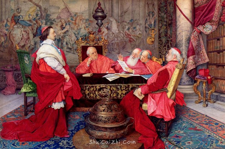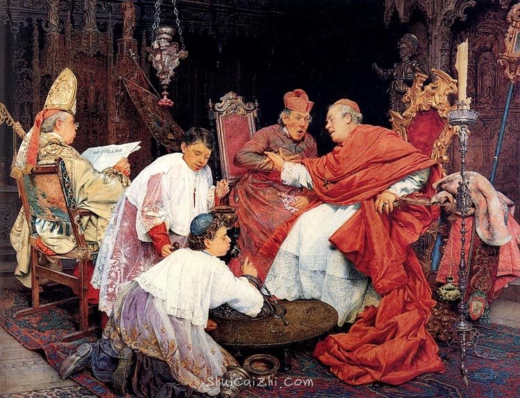 这幅是用透明水彩画就的。中间那四个人干什么哪?左侧那两个小孩,一位用铁夹子夹着什么东西,并用嘴吹着,他旁边那位帮着忙。右边两大人,一位右手抚胸想 表白什么,另一位用手推着,不想让那个人说。中间这四个人正好组成了一个圆,但这四个人都不是画面中心。中心人物是在这个圆外、靠左侧的那位大主教(是大 主教吧?)。一开始,我们的眼睛肯定看中间那四个人。但过一会儿,我们的眼睛会不自觉地移向那位大主教。这里面是构图起了一定作用。