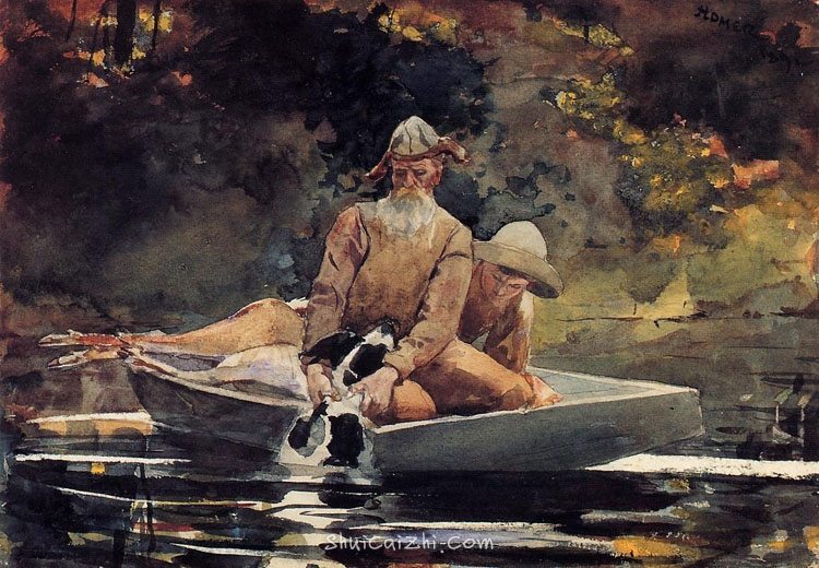 天色渐晚,祖孙二人收拾鱼具准备返航。画家重点刻画老人面部——沉稳中隐着一丝紧张。爱孙从背后探过头来,忐忐的、是新手。背景丛林做虚的处理;而近处的 水面,通过色彩变化和笔触的运用,很好地表现出水的质感。从整个色调看,似与上一幅有些雷同,而我们绝无雷同之感。为什么?归根到底,是画家的水平起作 用。那些用颜色画素描的水彩画,从本质讲,都是雷同的,因为它根本没有色彩。而色彩高手,绝不会与“雷同”联姻。