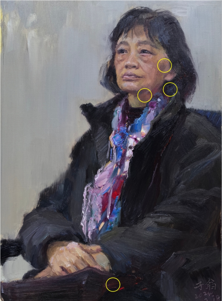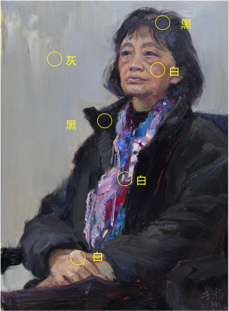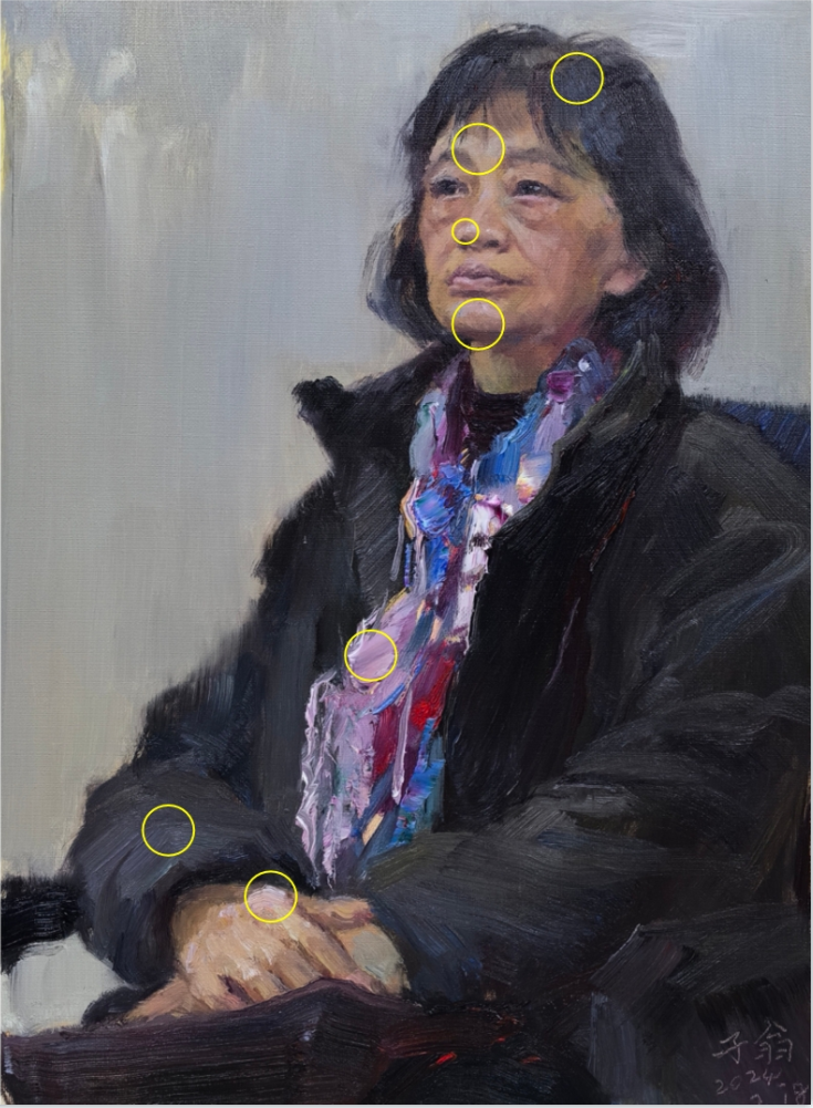 油画入门 入门教程,油画的写生和创作技巧 美术教程 shuicaimo · 2024-04-11 在观众的眼里,油画往往给人以逼真的感觉,但观众往往又说不出它为什么会逼真。其实油画创作是有技巧的,遵循它,就可以使油画很好地逼近我们视觉所见的景象。下面就以这幅人像作品为例,简单地展示一下如何在画面中看出油画的写生和创作技巧。 这些地方采用了光源色 这些地方是环境色 这些地方体现了黑白灰的对比 这些地方体现虚实对比 造型重点和色彩中心分别在这里 从这里可以看出画面的韵律特点和边缘节奏 人物油画 图文教程 常用技法