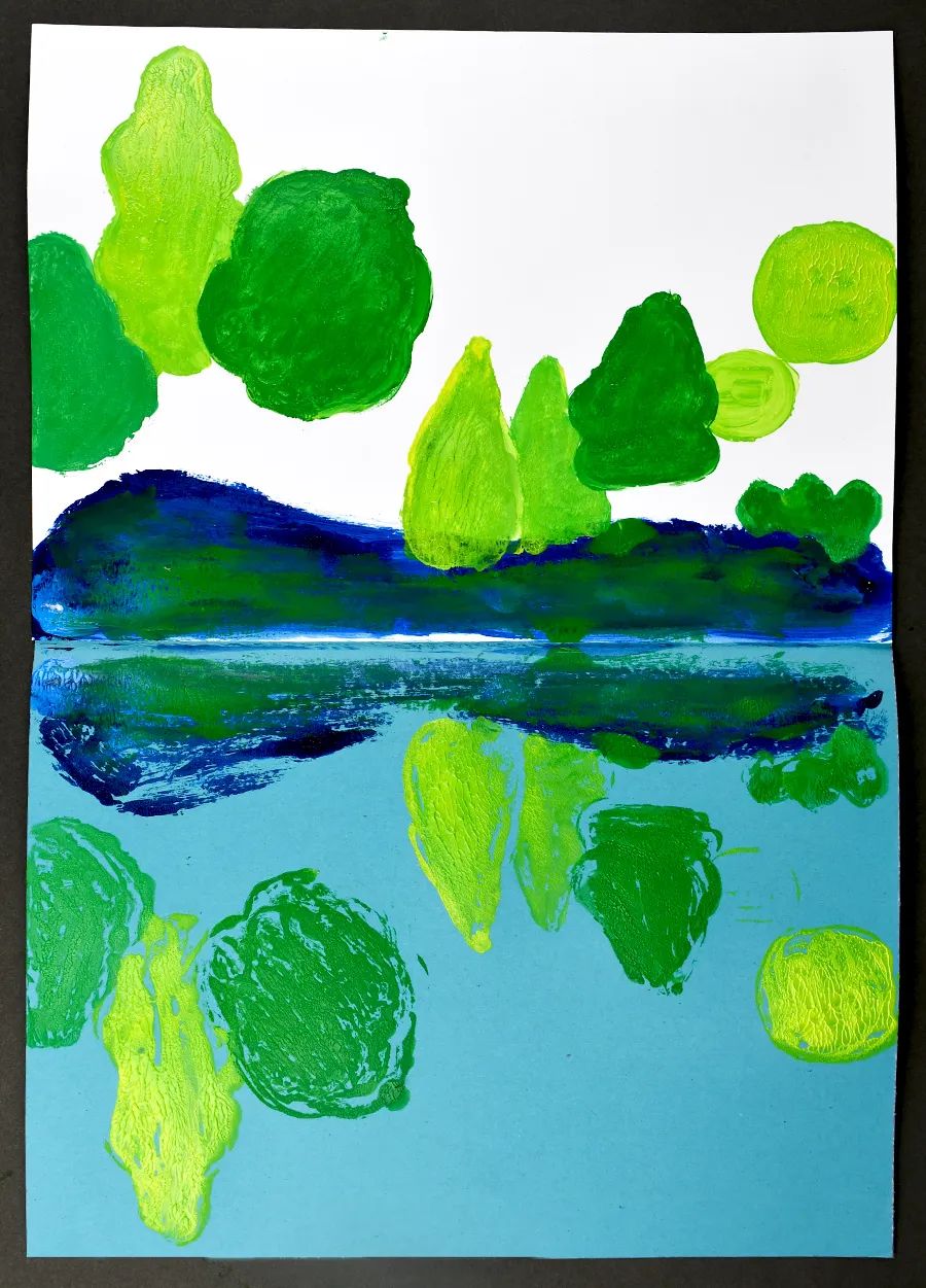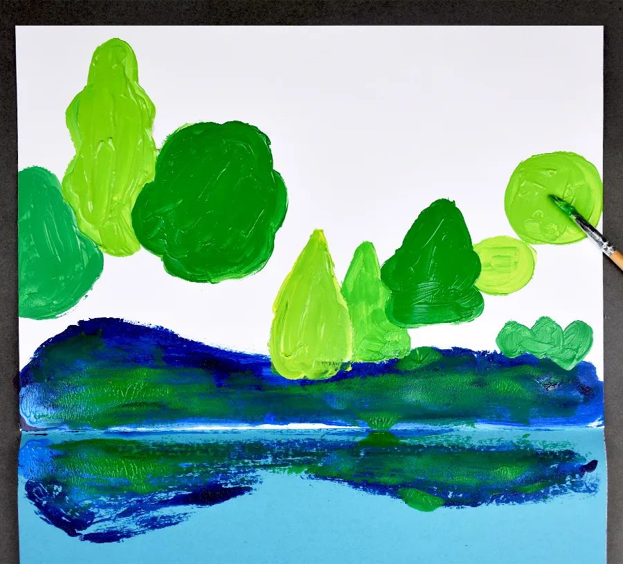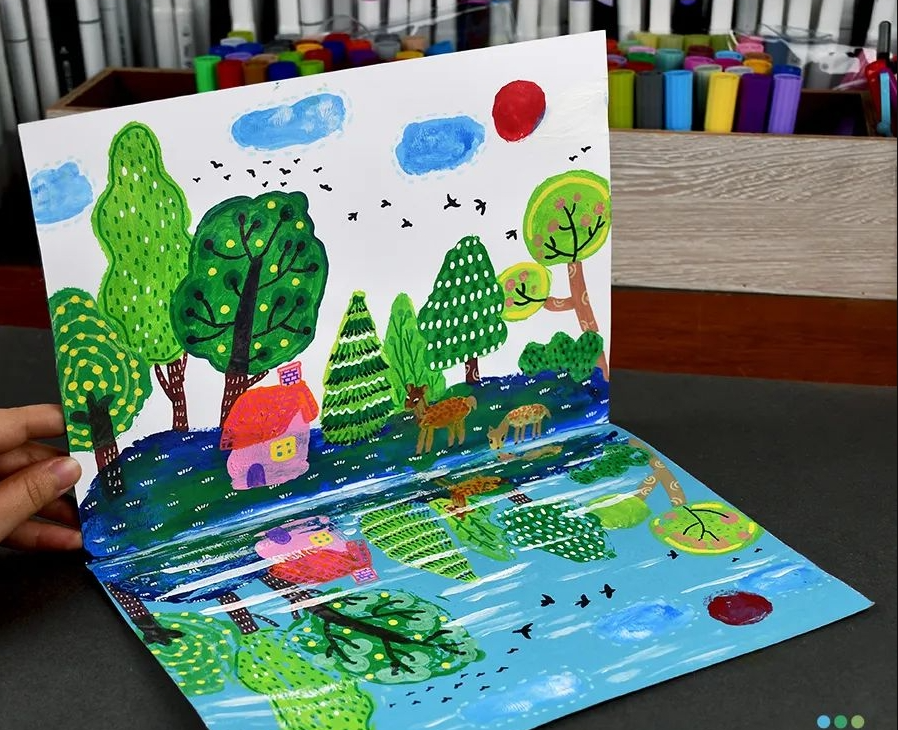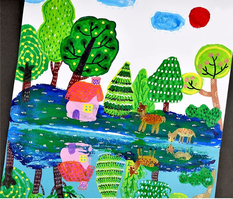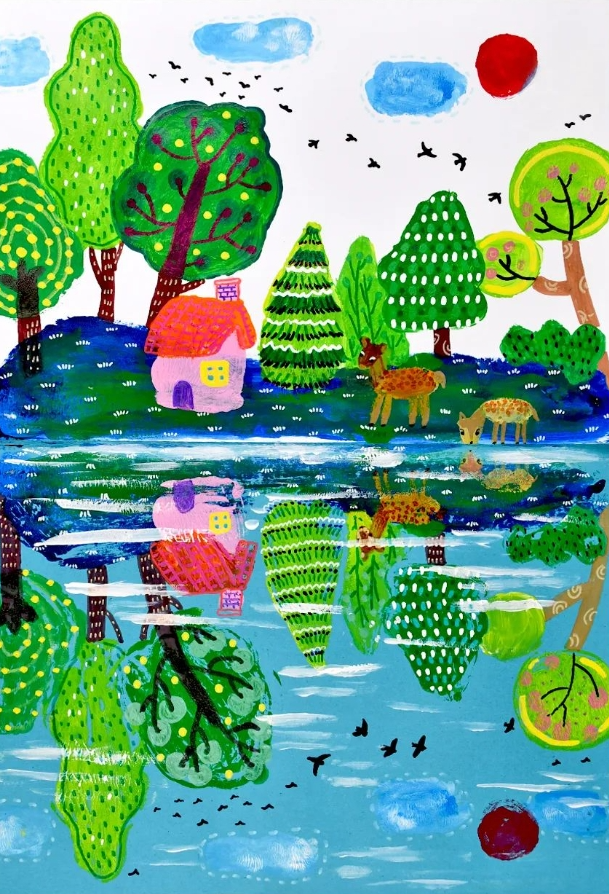 水彩画自学教程风景简单,水粉颜料下的湖边风景 水彩粉画 shuicaimo · 2024-04-12 通过理解倒影对称性的概念,我们可以在绘画创作中运用这一原理来创造美妙的作品。首先,准备一张纸,一半蓝色,一半白色。在白色部分,我们用水粉颜料绘制出迷人的自然景观,包括山坡、树木、房屋和动物等,通过巧妙的布局展现湖畔的风光。在颜料尚未完全干透时,将纸对折并轻轻压印,使得蓝色部分呈现出这些景物的倒影。之后,再用细笔在画面上添加和修饰细节,让整个画面更加生动和精致。这种创作方法不仅能够轻松捕捉倒影的迷人效果,也让我们深刻体验到倒影的独特魅力。 将一张蓝色卡纸贴在对折的白卡纸上形成一半蓝色一半白色 沿着中间的对折线上方绘画出山坡将纸上对折印出蓝色水面的倒影 用深浅不同的绿色水粉颜料在山坡上绘画出高低大小的树木 趁颜色未干之际,翻折过来,压印出湖面上的树木倒影 通过多次的压印,呈现出山坡与湖面对称的景象 运用同样的方法,我们创作出画面中的房子、小动物等 待颜料稍干后,用水彩笔、马克笔等添加画面的细节 比如树的纹理、房子和动物的细节等,使画面内容更加生动形象 最后用白色颜料以短笔触,添加出湖面上长短的波纹 小清新 常用技法 水彩画 风景画