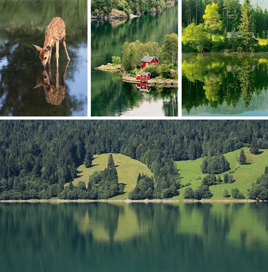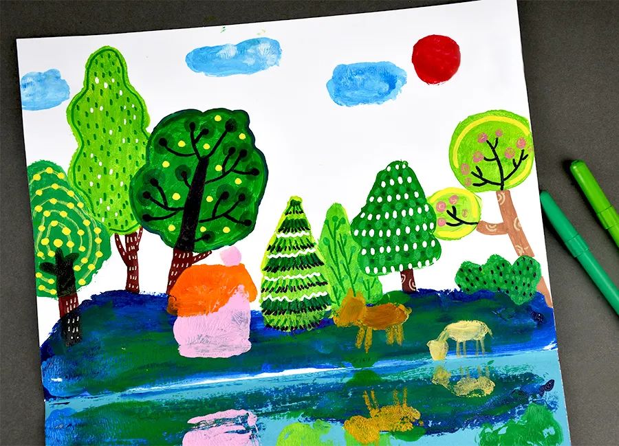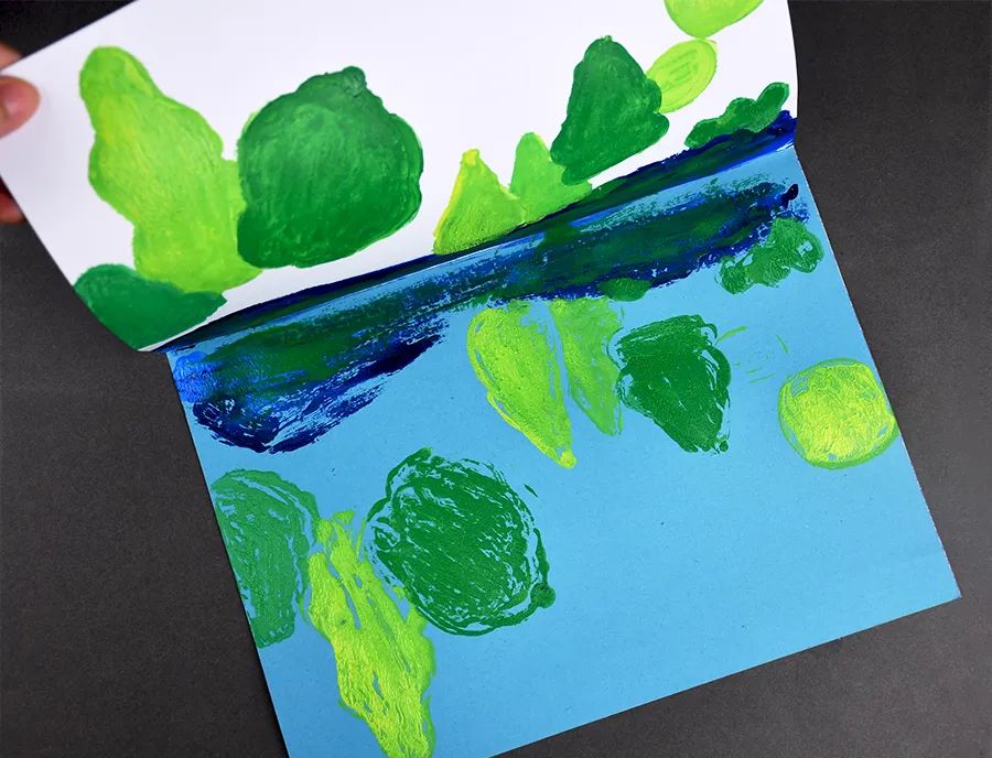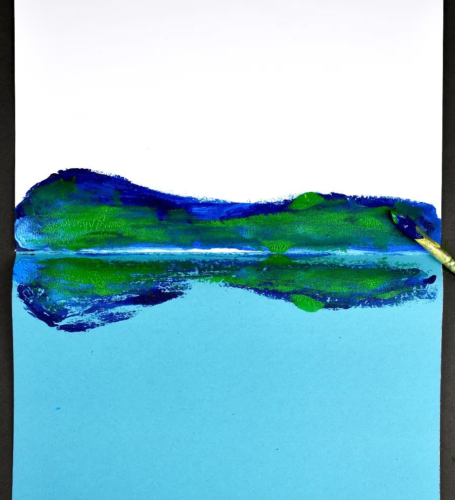 水彩画自学教程风景简单,水粉颜料下的湖边风景 水彩粉画 shuicaimo · 2024-04-12 通过理解倒影对称性的概念,我们可以在绘画创作中运用这一原理来创造美妙的作品。首先,准备一张纸,一半蓝色,一半白色。在白色部分,我们用水粉颜料绘制出迷人的自然景观,包括山坡、树木、房屋和动物等,通过巧妙的布局展现湖畔的风光。在颜料尚未完全干透时,将纸对折并轻轻压印,使得蓝色部分呈现出这些景物的倒影。之后,再用细笔在画面上添加和修饰细节,让整个画面更加生动和精致。这种创作方法不仅能够轻松捕捉倒影的迷人效果,也让我们深刻体验到倒影的独特魅力。 将一张蓝色卡纸贴在对折的白卡纸上形成一半蓝色一半白色 沿着中间的对折线上方绘画出山坡将纸上对折印出蓝色水面的倒影 用深浅不同的绿色水粉颜料在山坡上绘画出高低大小的树木 趁颜色未干之际,翻折过来,压印出湖面上的树木倒影 通过多次的压印,呈现出山坡与湖面对称的景象 运用同样的方法,我们创作出画面中的房子、小动物等 待颜料稍干后,用水彩笔、马克笔等添加画面的细节 比如树的纹理、房子和动物的细节等,使画面内容更加生动形象 最后用白色颜料以短笔触,添加出湖面上长短的波纹 小清新 常用技法 水彩画 风景画