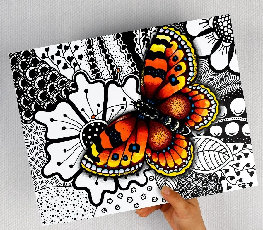 用禅绕画的艺术形式填充背景,使背景中黑白的点线面与鲜艳的蝴蝶形成鲜明的对比,增强作品的装饰性和视觉表现力。在绘画的过程中,除了前景的蝴蝶,背景同样扮演着至关重要的角色。在为作品的背景选择填充时,我们可以采用禅绕画这一充满魅力的艺术形式。在绘制禅绕背景时,线条的疏密、曲直、粗细及整体的黑白灰变化都成为调和画面的关键因素,赋予了作品丰富的层次和深度。正是这样丰富而具有变化的禅绕背景,与前景中色彩鲜艳、活力四溢的蝴蝶形成了鲜明的对比。这种对比不仅让作品更具装饰感,同时也增强了视觉的吸引力。