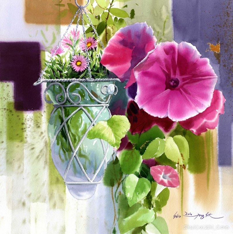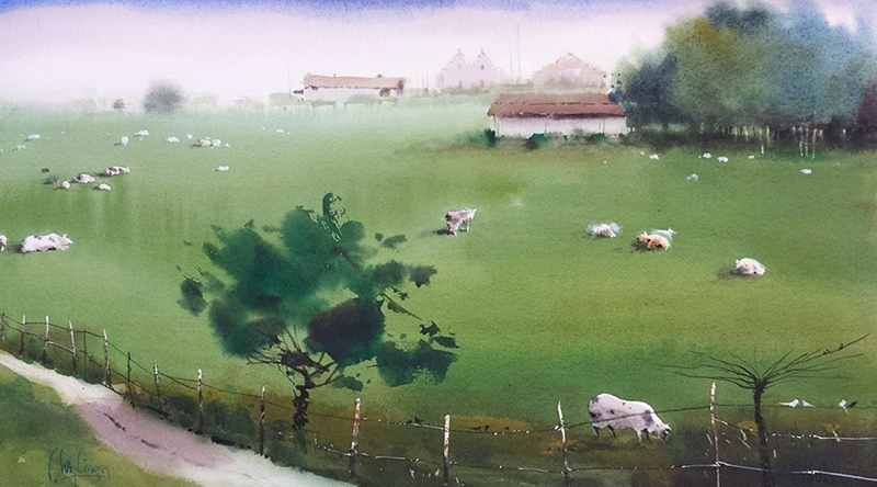 画水彩大都有干画、湿画结合进行,湿画为主的画面局部采用干画,干画为主的画面也有湿画的部分,干湿结合,表现充分,浓淡枯润,妙趣横生。