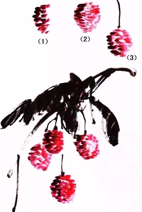 樱桃虽小,但色彩鲜艳,玲珑剔透,殷红欲滴,果小柄长,一蒂多果。画时可用鲜红色点厾,加上浓墨果柄。一堆樱桃要分浓淡、前后和透视,忌平涂。