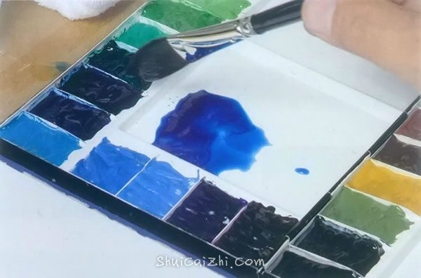 但是,基本色套装为了压低价格装入称作FUE的相似颜料,这里面不会包含高价的水彩颜料。有些颜料尽管各称相同,但厂家不同色彩效果也会不同。如果是土制 的水彩颜料,黏土的产地(由赭土等制造的颜料)不一样,色感也会不同。选购不同品牌的散装颜料,组合一套水彩颜料,其实这也非常有趣。现在开始准备水彩颜 料和调色板。