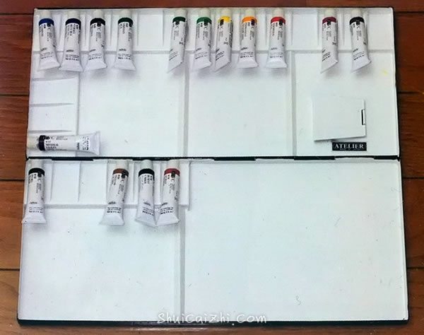 使用之前最好不要盲目挤出颜料来,可以先按照色相顺序直接排列颜料管。24栏的象牙墨,很容易生霉。