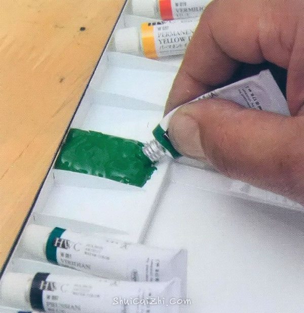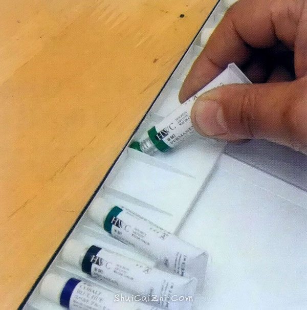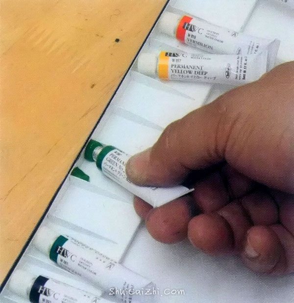 首先,从一角开始挤压塞进水彩颜料。颜料要紧紧地塞满栏角,尽可能减小表面积,从而防止水彩颜料快速干掉。
