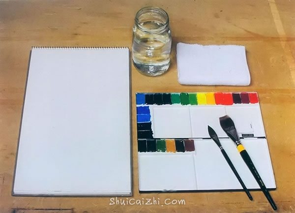 配齐了必要的工具,那么就要准备开始水彩画了。为了以稳定的姿势作画,先想好怎么摆放各种工具。这里介绍的是用右手作画的工具摆放例子。如果读者用左手作画,可以颠倒左右顺序摆放工具。