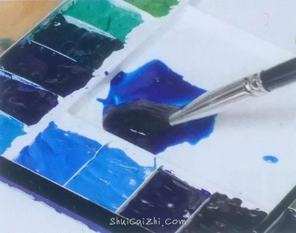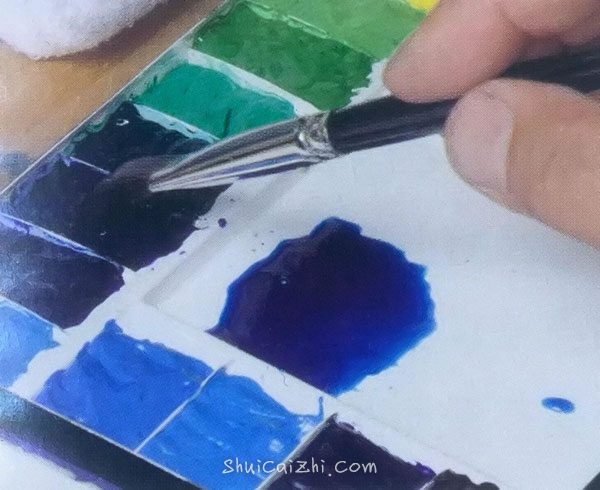 1. 大量吸取接近物体颜色的颜料后,加入其他色彩颜料,调出更接近物体颜色的混合色彩。