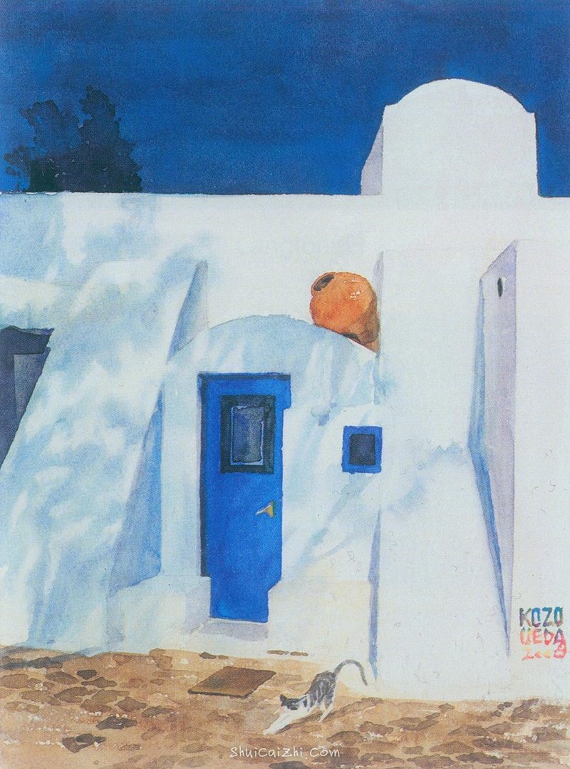 水彩画:午休(米克诺斯岛),画家:上田耕造