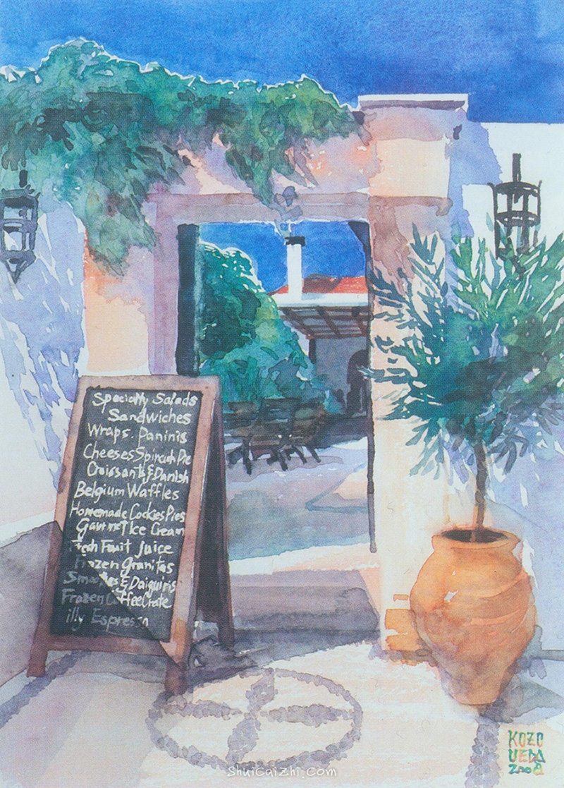 水彩画:林多斯的料理店(罗德斯岛),画家:上田耕造