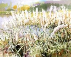 白色墙壁上映着的树影随风摇动,伸懒腰的小猫在提示人们午休时间已过。画家上田耕造作画的起点是树影,这部分是以湿破湿画法表现出来的。为了加深天空的颜色,特意将颜料重复涂了好几次。最终建筑物的白色显得特别艳丽。