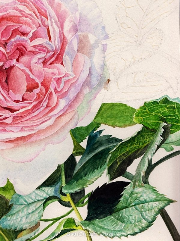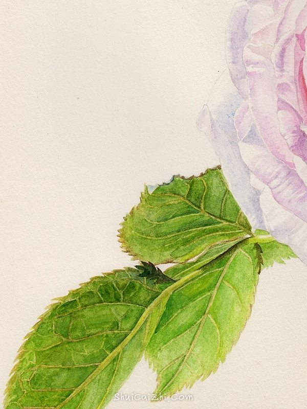 先画左边的叶子吧,注意是背面,不会有叶子正面那种深绿色,也不会有太强的高光。颜色偏草绿一些。叶子的筋脉我用了留白胶,等画完大色调后,去掉留白胶,再用黄绿色画出来。