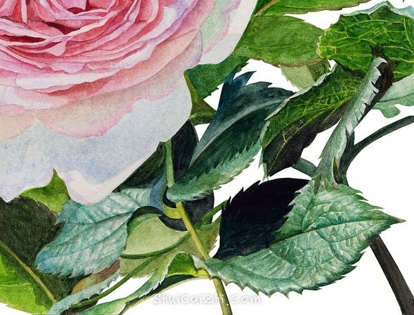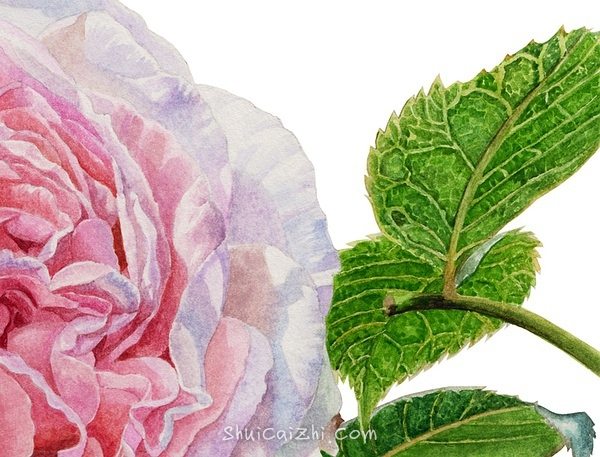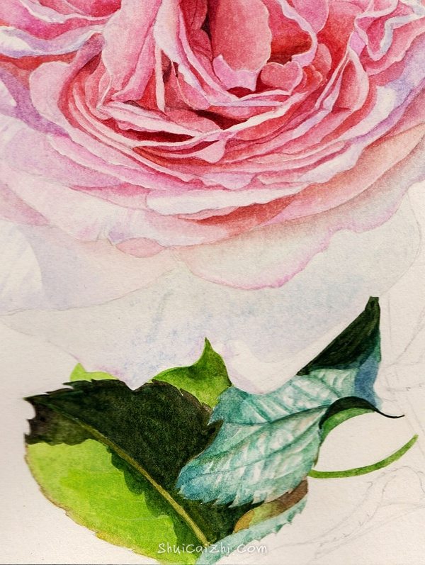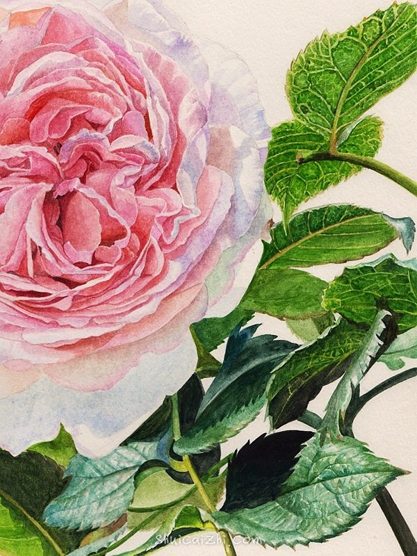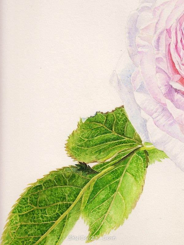 上面几片叶子和左下角的那几片画法是一样的,整体铺色完成以后,开始加细节。画完以后,再把花朵的下方加深一下,不然感觉上花朵的分量有点轻。