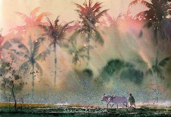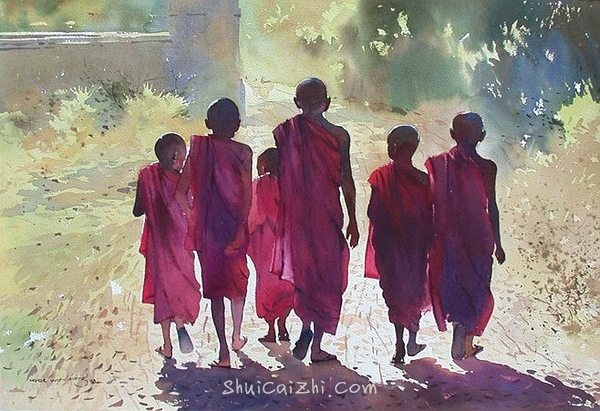 这种毛绒绒的、看起来稳稳的色彩过渡也需要棉浆纸,在木浆上估计会满是大水花~(作者:缅甸画家Myoe Win Aung)