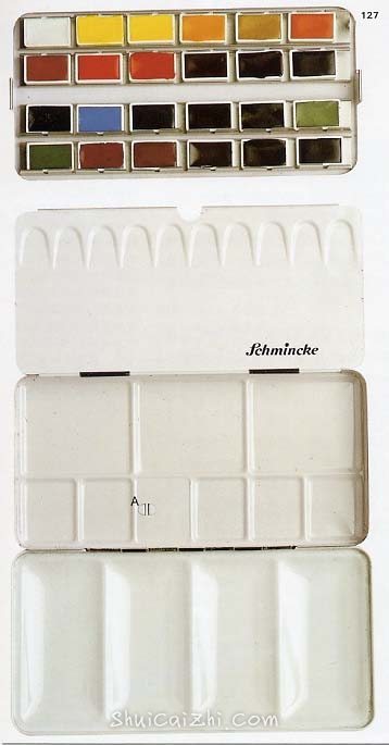 内装二十四片湿水彩颜料的颜料盒,盛颜料的盘子可与金属盒分离,以便有更大的调色空间,中间的调色盘上可以看见一个铆钉(A),它装上一个可用左手拇指端调色盘的环。画完之后将颜料盘放回盒内,可将盒子折叠关闭。