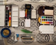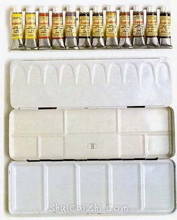 内装十二管专业品质水彩颜料的颜料盒,颜料锡管可从盒中取出,将盒子作为调色盘,上有一个洞,左手大拇指从洞中握住调色盘。